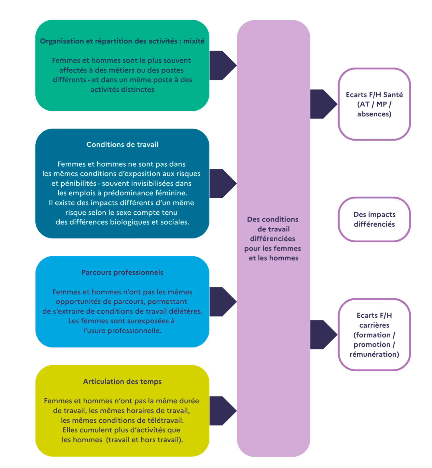> Exemple : impact différencié des agents chimiques, du port de charge…, impact d’un horaire atypique, impact d’un management sous pression…