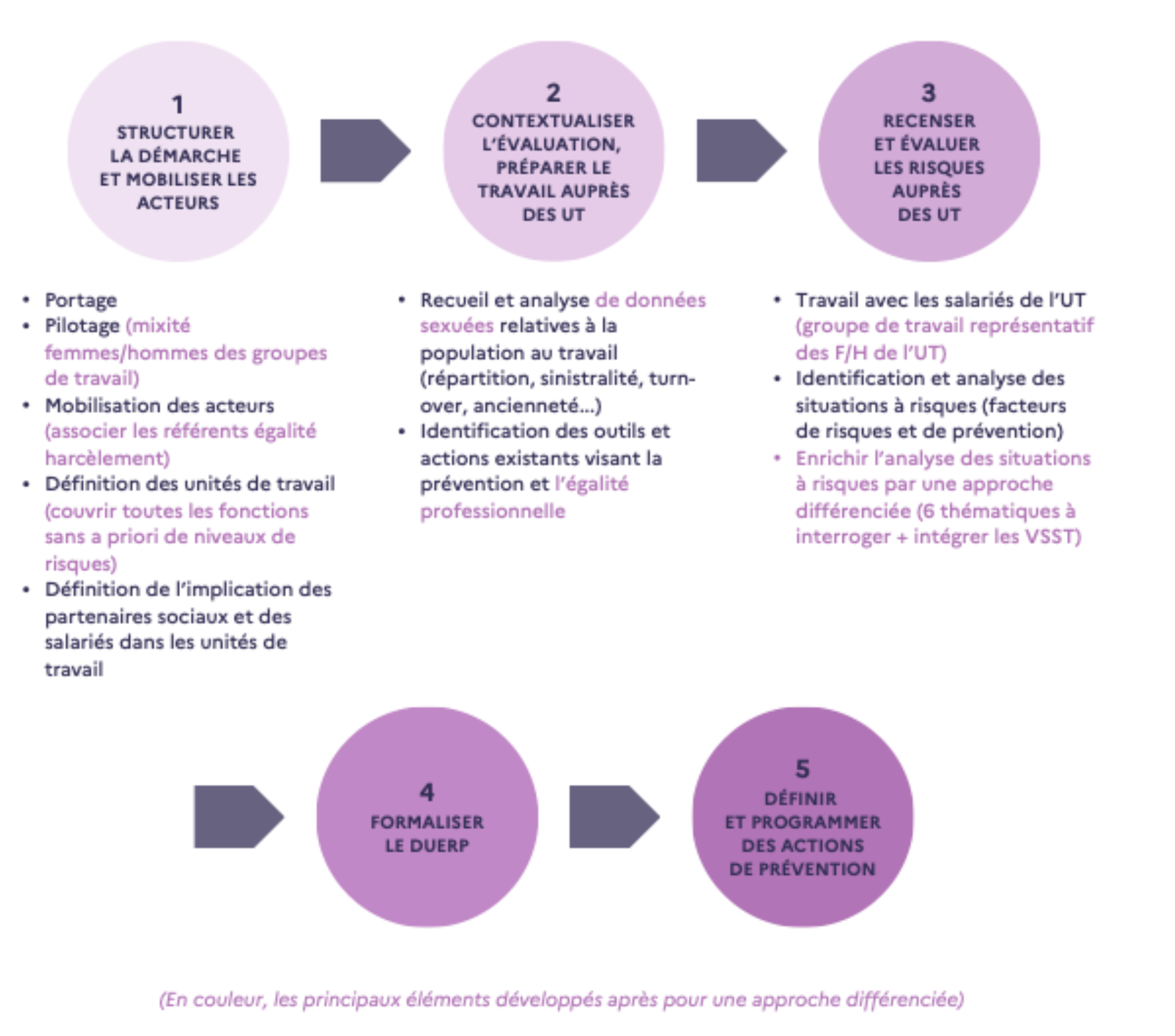 - La prise en compte différenciée des risques professionnels femmes/hommes est possible grâce à une méthodologie concrète, mise en œuvre tout au long des étapes de l’évaluation des risques (le guide propose des clés pour réussir ces différentes étapes)