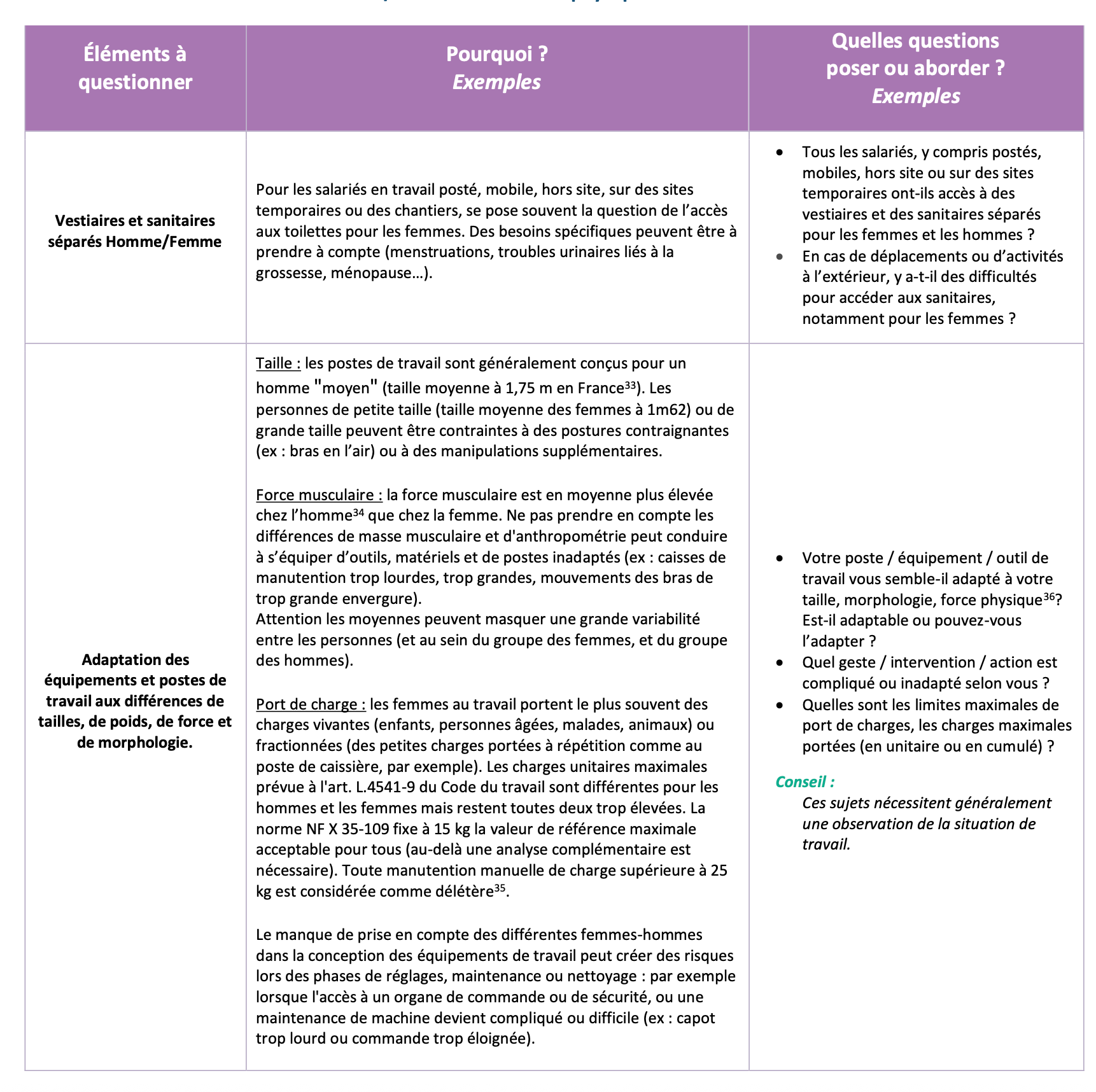 - Le DUERP n’est pas une fin en soi mais permet ensuite le déploiement concret d’un programme des actions de prévention (le guide propose une série de questions à se poser afin de s’assurer de la bonne prise en compte des différences des femmes et des hommes dans les situations de travail)